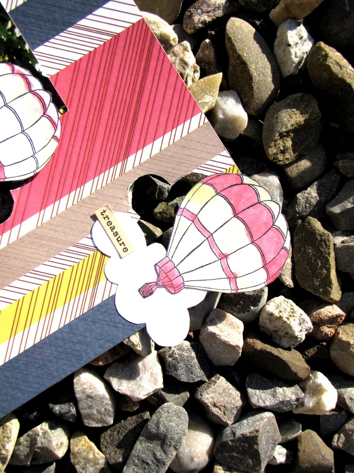 I stamped 3 cute hot air balloons on the white cardstock, and coloured them using alcohol ink diluated with water... I adhered these 3 balloons near the clouds, of course ;)
