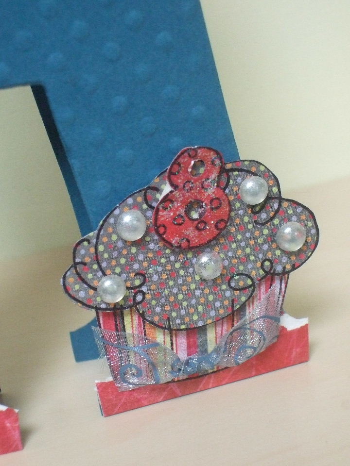I decorated the letter with papers, my saying, and a cupcake, and finished it off with glitter and glitz.